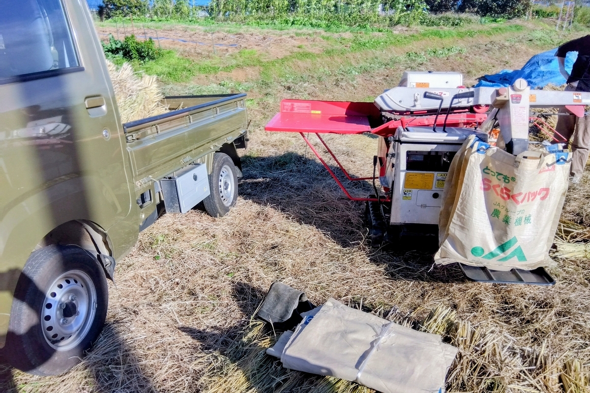 2025-11-04 25/11/03 恩田川の田圃 脱穀終了 恩田川の田圃 自家採種 10月中は、晴れが少なく稲が乾かず田んぼもぬかるんだまま。水の流入を止めようといろいろ試しましたが、水口が常に水の中にあり手探りで蓋しても止まらず原因不明。しかたなく去年と同じく畑に持ち出して、脱殻でした。 まあ、それでも、迷って時間を要することが少なくなり、昨年(11/08)より早く終えました。まだ稲架に掛けてある自家採種用の稲束(品種登録期間切れの古い品種)、この分は、手作業で行う予定で、これを終えれば本当に今年の脱穀終了です。